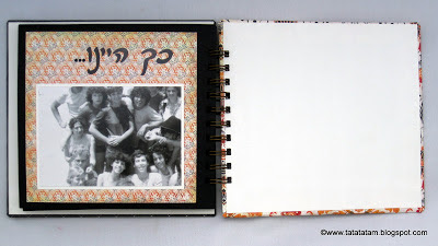 כפיצוי על המונוטוניות של התמונות בחרתי בדפים מקולקציות שונות של BasicGrey. כאלה שיהיו צבעוניות מספיק - אבל לא נשיות מדי. כתום/שחור/אפור נראה לי שילוב מתאים - ויחד עם נפלאות הביינד-איט-אול יצא אלבום קטן (17X17 בערך), שיש בו 8 דפים דו צדדיים מקארדסטוק שחור + כריכה. בחלק מהמקומות ציינתי תאריכים וכתבתי כמה מלים, בכפולה אחת שילבתי שיר שהיינו שרים בתנועה (ושגם מדבר על גיל 50), ובחלק מהעמודים השארתי לבנדה מקום לכתוב פרטים נוספים.
